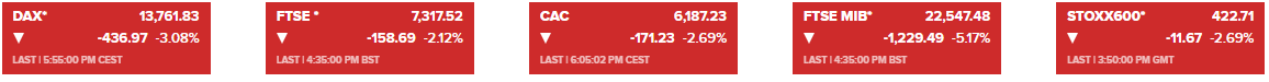 Chỉ số DAX giảm 437 điểm (tương đương 3.08%), còn chỉ số FTSE MIB sụt mạnh 1,229 điểm (tương đương 5.17%).