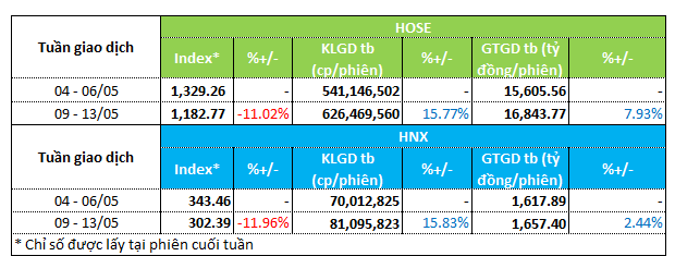 Chuỗi ngày đỏ lửa của chứng khoán Việt kéo dài sang tuần 09 - 13/05 và thậm chí còn tồi tệ hơn các tuần trước. VN-Index tuần qua ghi nhận mức giảm hơn 11% về còn 1,182.7 điểm, HNX-Index giảm gần 12% về 302.4 điểm.