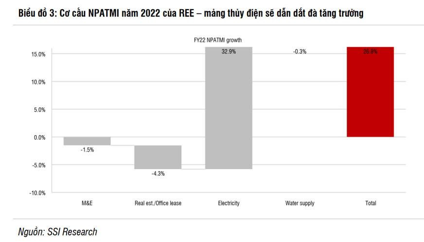 Mực nước hồ thủy điện duy trì ở mức cao trong quý 2/2022, SSI ước tính lãi ròng quý 2/2022 của REE sẽ duy trì khoảng 690 tỷ đồng (tăng 80% so với cùng kỳ). Mức tăng trưởng lãi ròng trong quý 2/2022 nhờ mảng điện tăng 3 lần trong khi mảng cấp thoát nước đi ngang; và mảng cho thuê văn phòng tăng 12% so với cùng kỳ, bù lại mức giảm 42% ở mảng cơ - điện (M&E).