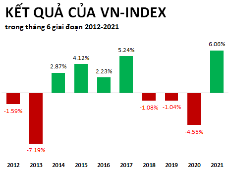 Không chỉ số lượng cổ phiếu thường tăng và thường giảm khá cân bằng, diễn biến VN-Index trong tháng 6 của 1 thập kỷ qua cũng có kết quả ngang nhau khi có 5 năm tăng điểm và 5 năm giảm điểm.