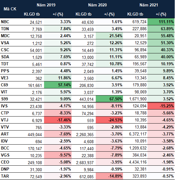 Cổ phiếu trên sàn HNX tăng/giảm giá trong tất cả tháng 6 giai đoạn từ 2019-2021