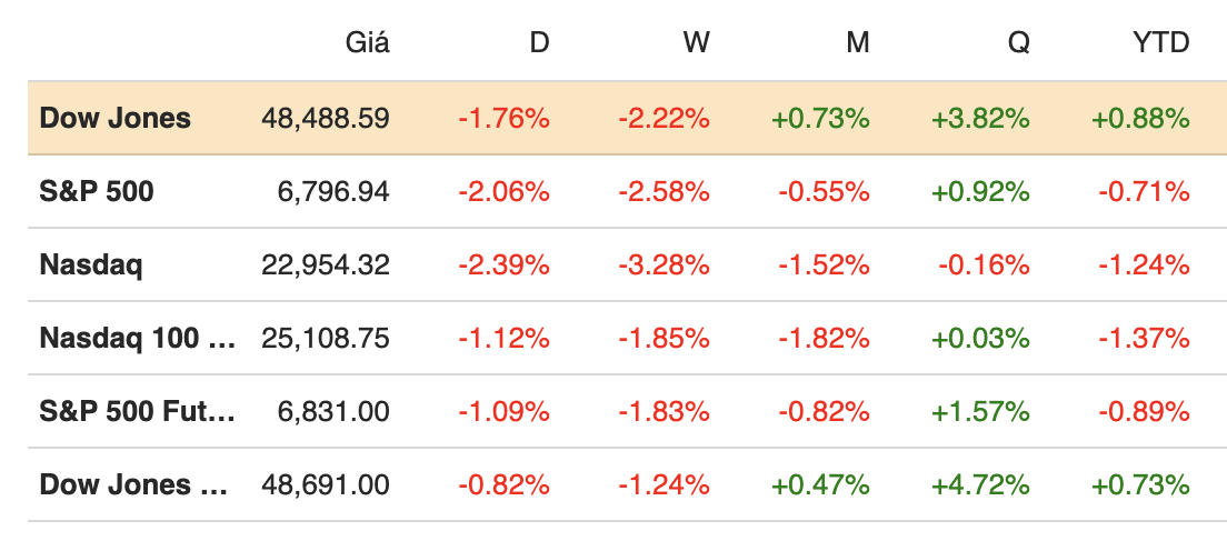 Khép phiên ngày 20/01, chỉ số Dow Jones giảm 870.74 điểm, tương đương 1.76%, chốt phiên tại 48,488.59 điểm. S&P 500 mất 2.06%, đóng cửa ở 6,796.86 điểm, trong khi Nasdaq Composite giảm 2.39%, xuống 22,954.32 điểm. Đây là phiên giảm mạnh nhất kể từ tháng 10 đối với cả ba chỉ số chính.