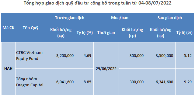 Cụ thể trong phiên 29/06/2022, quỹ thành viên CTBC Vietnam Equity Fund của Dragon Capital đã mua 300,000 cp HAH (CTCP Vận tải và Xếp dỡ Hải An), tăng sở hữu tại đây từ 3.2 triệu cp (tỷ lệ 4.69%) lên 3.5 triệu cp (tỷ lệ 5.12%), trở thành cổ đông lớn của HAH.