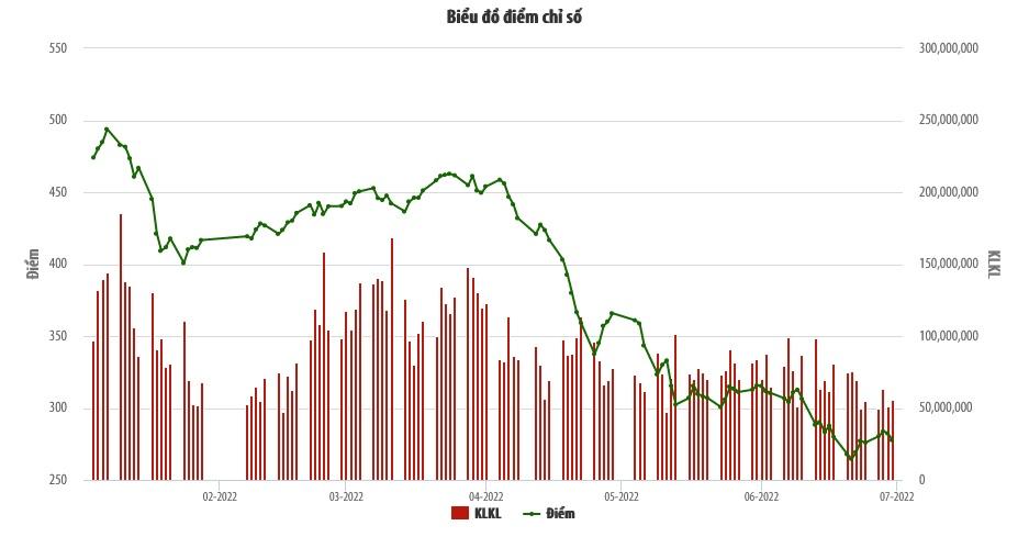 Cụ thể, HNX-Index sau khi đạt mức cao nhất 493.84 điểm vào ngày 07/01/2022 thì có xu hướng giảm liên tục và giảm mạnh trong quý 2, kết thúc quý 2 tại mức 277.68 điểm - giảm 41.4% so với cuối năm 2021. Ngày 21/06/2022, HNX-Index đóng cửa thấp nhất đạt 264.62 điểm.