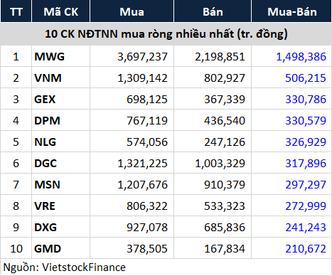 Mặt khác, MWG và VNM là hai cổ phiếu được mua ròng nhiều nhất tháng với giá trị lần lượt đạt 1,498 tỷ đồng và 506 tỷ đồng.