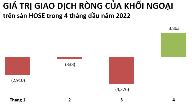 Theo dữ liệu từ VietstockFinance, khối ngoại đã mua ròng 3,863 tỷ đồng trong tháng 4/2022, qua đó kết thúc chuỗi 8 tháng liên tiếp bán ròng (từ tháng 8/2021). Trong khi đó, khối ngoại lại tiếp tục bán ròng trên sàn HNX, tuy nhiên giá trị chỉ ghi nhận 31 tỷ đồng, giảm hơn 34% so với tháng trước.