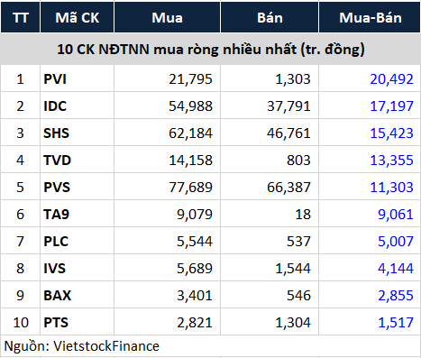 Còn với chiều mua ròng, khối ngoại tiếp tuc mua ròng 6 cổ phiếu PVI, IDC, SHS, TVD, TA9 và BAX so với tháng trước. Trong đó, PVI được mua ròng nhiều nhất với hơn 20 tỷ đồng.