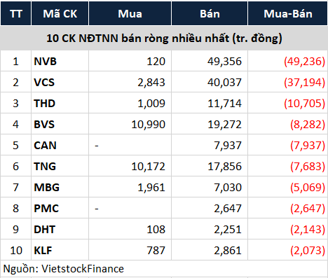 Trong khi đó ở sàn HNX, khối ngoại tiếp tục bán ròng một số cổ phiếu quen thuộc đã xuất hiện trong tháng trước như NVB, VCS, THD, BVS, TNG. Trong đó, NVB là cổ phiếu bị bán ròng nhiều nhất tháng khi giá trị bán ròng đạt hơn 49 tỷ đồng. VCS, THD, BVS lần lượt xếp sau với 37 tỷ đồng, 11 tỷ đồng và 8 tỷ đồng.