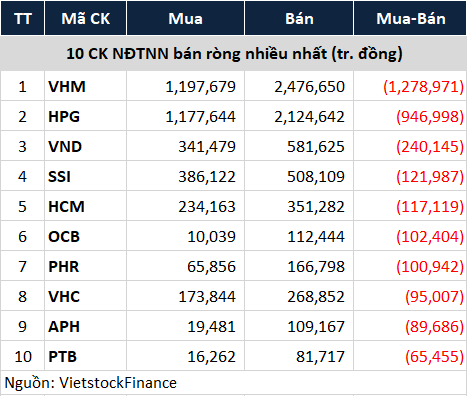 Ở chiều ngược lại, cổ phiếu của nhiều công ty chứng khoán lớn như VND, SSI, HCM đã bị bán ròng mạnh với tổng giá trị ghi nhận hơn 479 tỷ đồng.