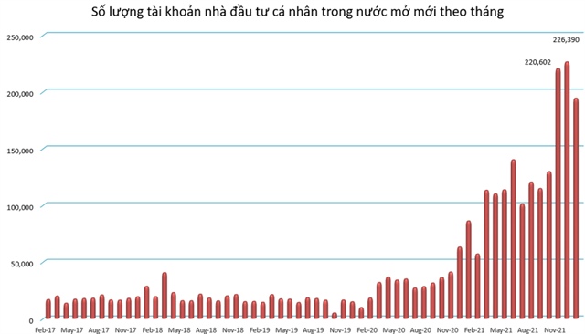 Số liệu từ Trung tâm lưu ký Chứng khoán Việt Nam (VSD) cho biết trong tháng 1/2022, nhà đầu tư trong nước mở mới 195.068 tài khoản chứng khoán, giảm 31.512 tài khoản so với thời điểm kỷ lục mở tài khoản trong tháng 12/2021. Con số này cũng giảm mạnh so với thời điểm tháng 11/2022 là 220.000 tài khoản.