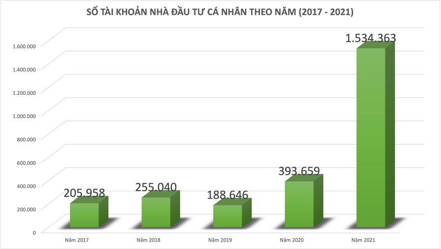 Trước đó, năm 2021, nhà đầu tư trong nước mở mới hơn 1,5 triệu tài khoản chứng khoán, lớn gấp rưỡi tổng số tài khoản mở mới trong 4 năm 2017; 2018; 2019 và 2020 cộng lại (tổng 4 năm đạt 1,04 triệu tài khoản).