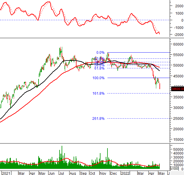 Hỗ trợ gần nhất là vùng 36,000-37,000. Nếu vùng này cũng bị thủng thì nguy cơ về đến mức 25,000 (tương đương Fibonacci Projection 261.8%) là rất cao.