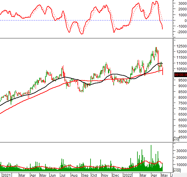 Trong phiên giao dịch ngày 09/05/2022, giá xuất hiện mẫu hình Black Marubozu và đồng thời phá vỡ đường SMA 100 ngày.