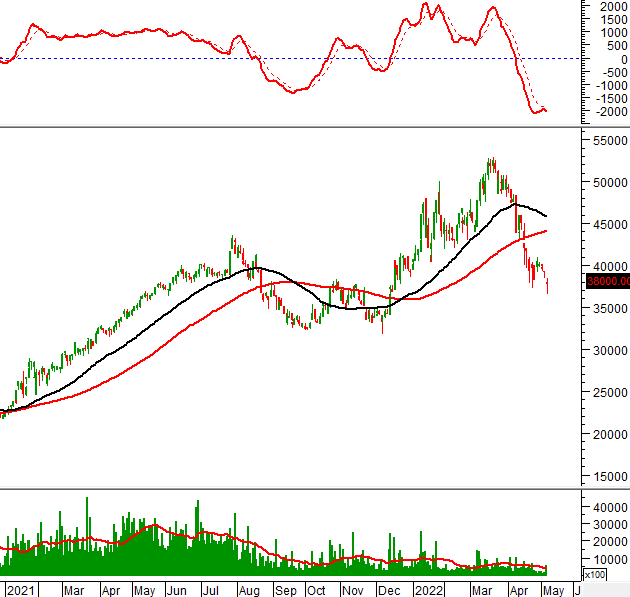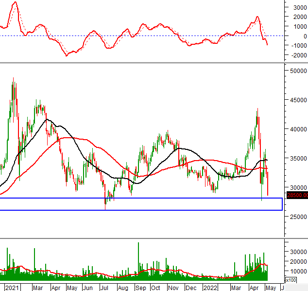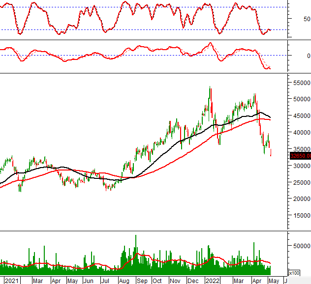 Trong phiên giao dịch ngày 09/05/2022, KSB hình thành mẫu hình nến Inverted Hammer trong vùng 32,000-33,000 (tương đương đỉnh cũ đã bị vượt qua tháng 01/2021). Nếu vùng này không bị phá vỡ thì tình hình sẽ bớt bi quan hơn.
