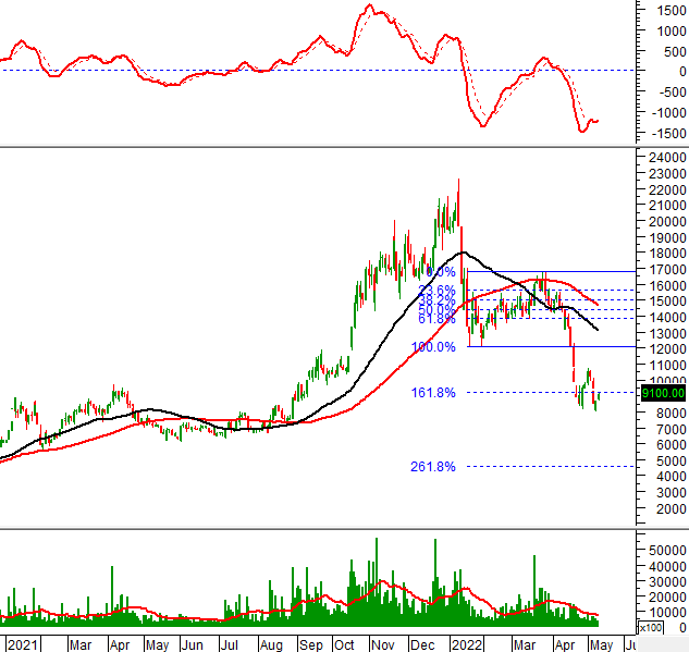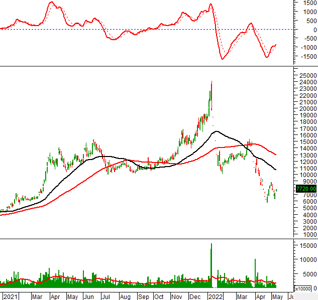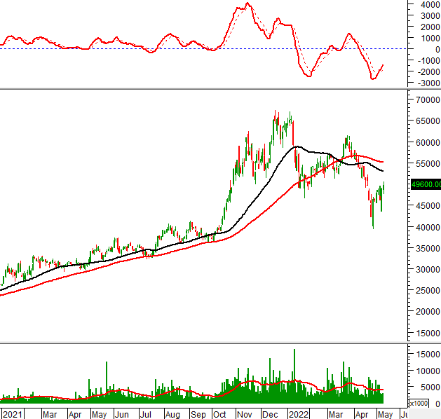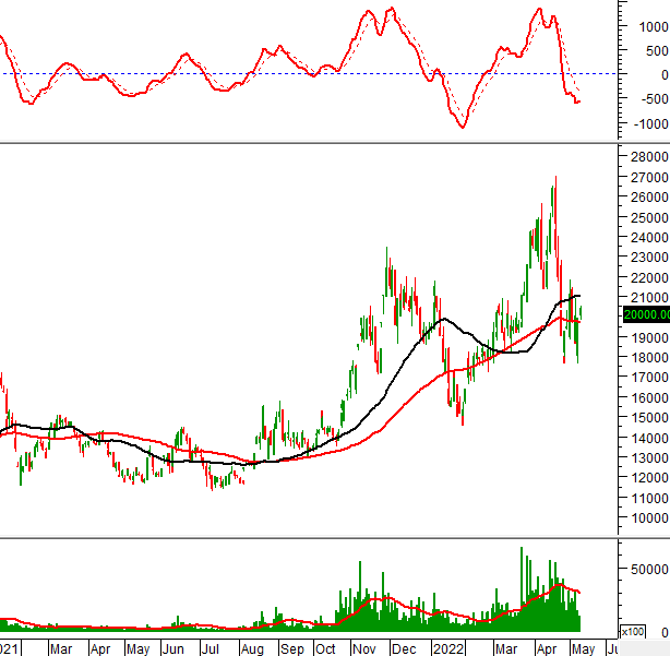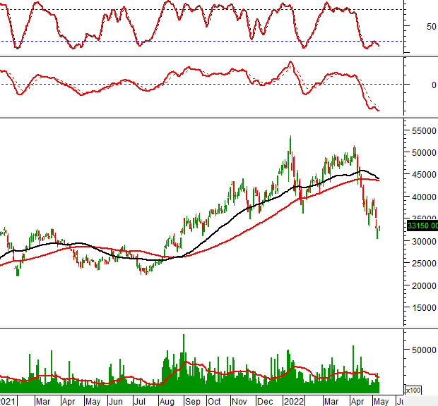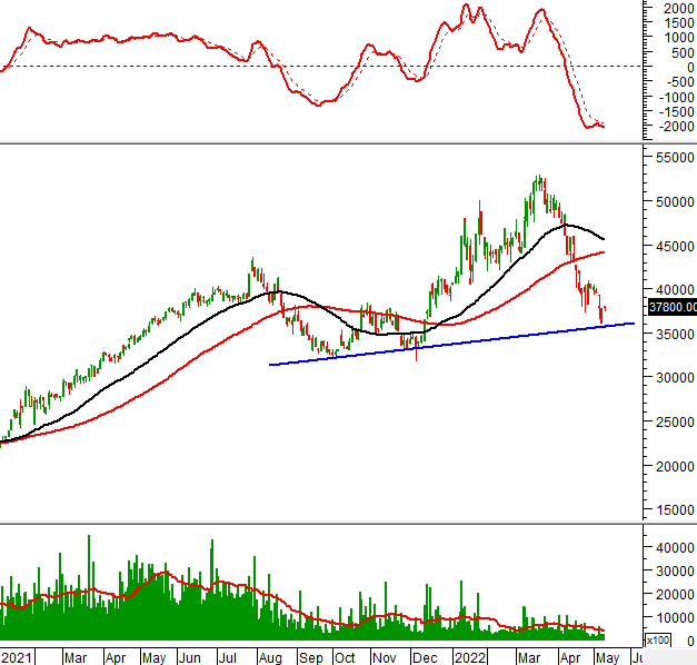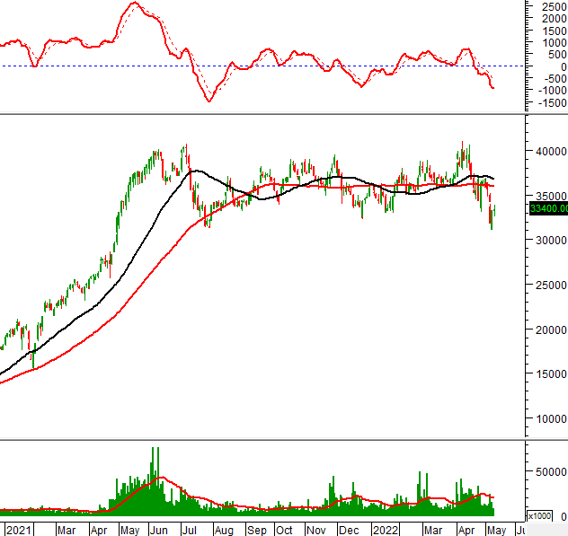 Trong phiên giao dịch ngày 11/05/2022, KSB hình thành mẫu hình nến Hammer trong vùng 32,000-33,500 (tương đương đỉnh cũ đã bị vượt qua tháng 01/2021). Nếu vùng này không bị phá vỡ thì tình hình sẽ bớt bi quan hơn.