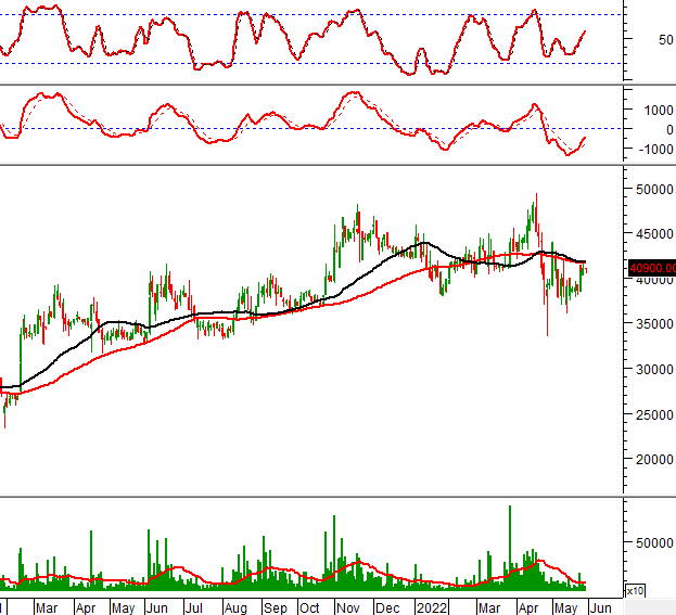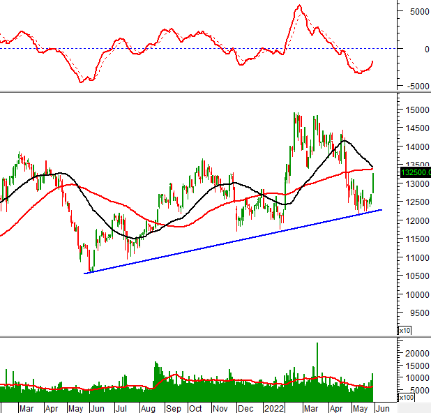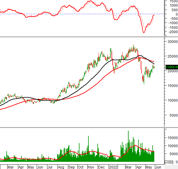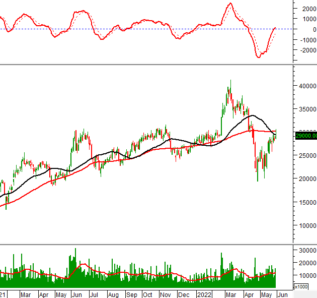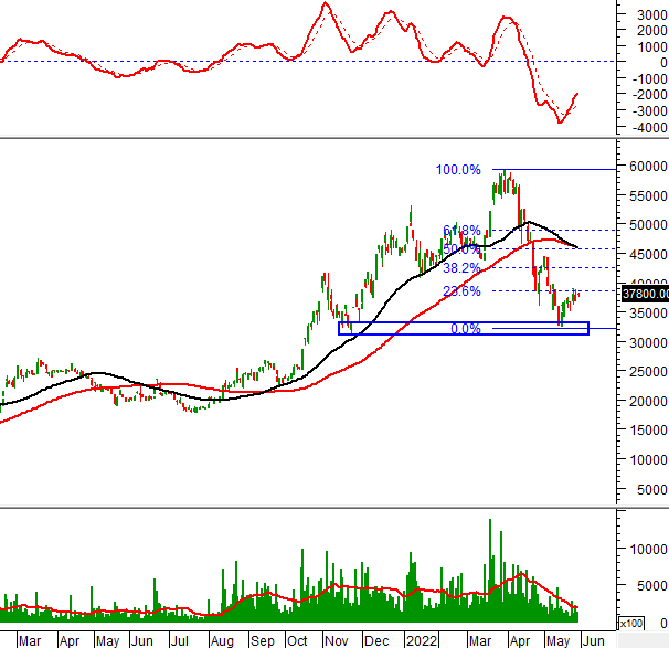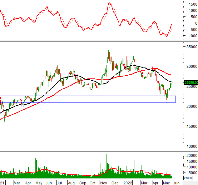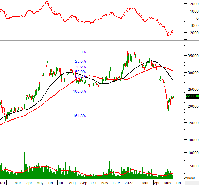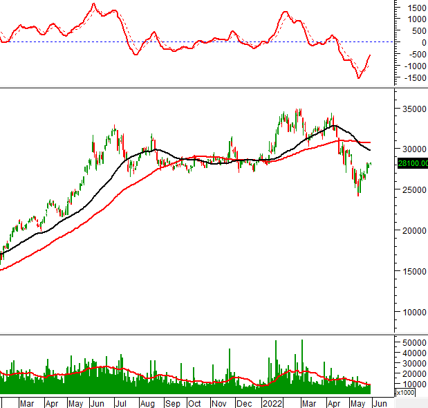 Giá điều chỉnh nhẹ trong phiên giao dịch ngày 30/05/2022. Tuy nhiên, HTN đã test thành công vùng 31,000-33,000 (tương đương đáy cũ của tháng 11/2021). Nếu vùng này tiếp tục trụ vững thì tình hình sẽ rất lạc quan.