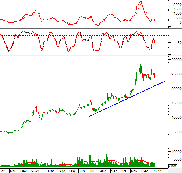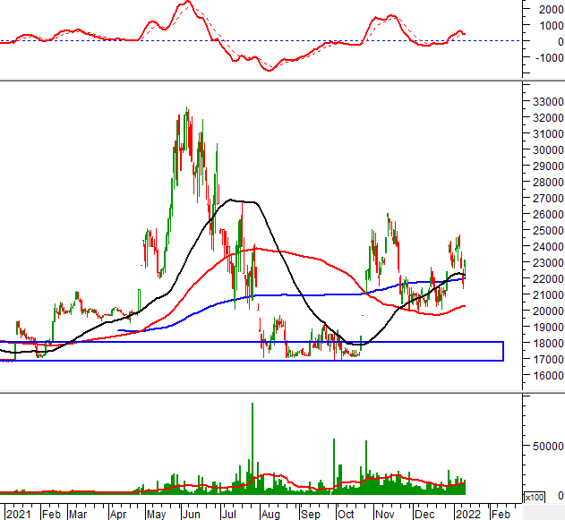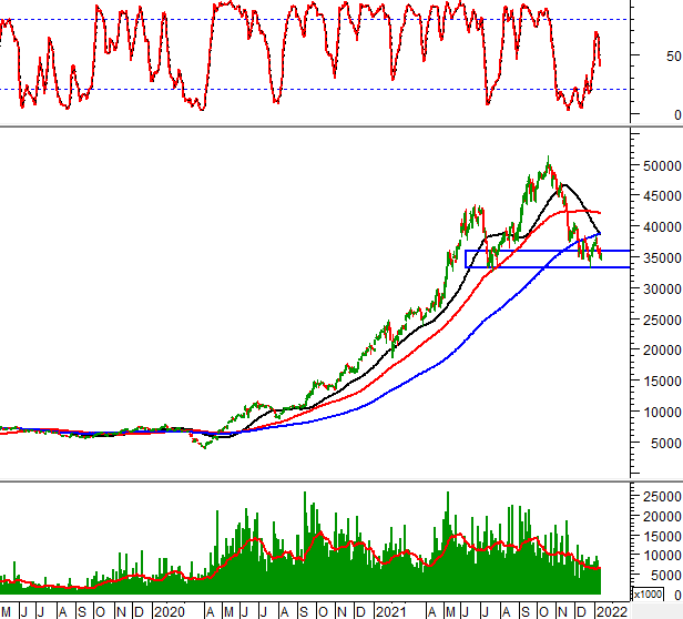 Trong phiên giao dịch ngày 12/01/2022, giá cổ phiếu HSG một lần nữa trở lại test vùng đáy cũ tháng 07/2021 (tương đương vùng 33,000-36,000). Ngưỡng này đã đóng vai trò hỗ trợ rất hiệu quả trong đợt sụt giảm vừa qua và được kỳ vọng sẽ còn trụ vững.