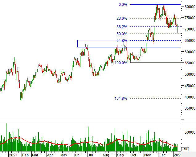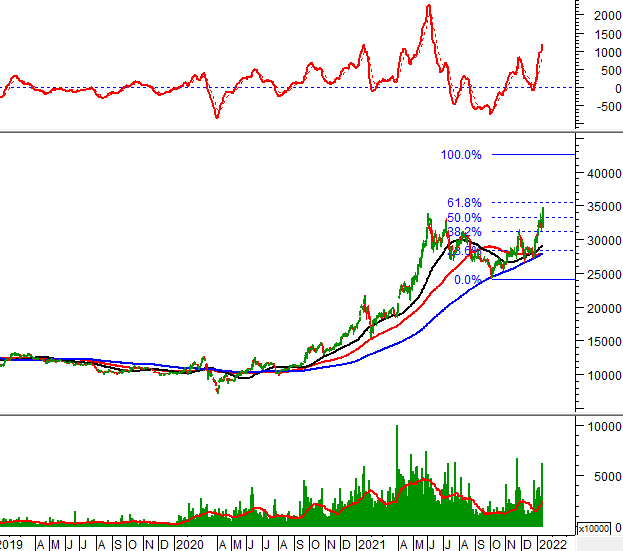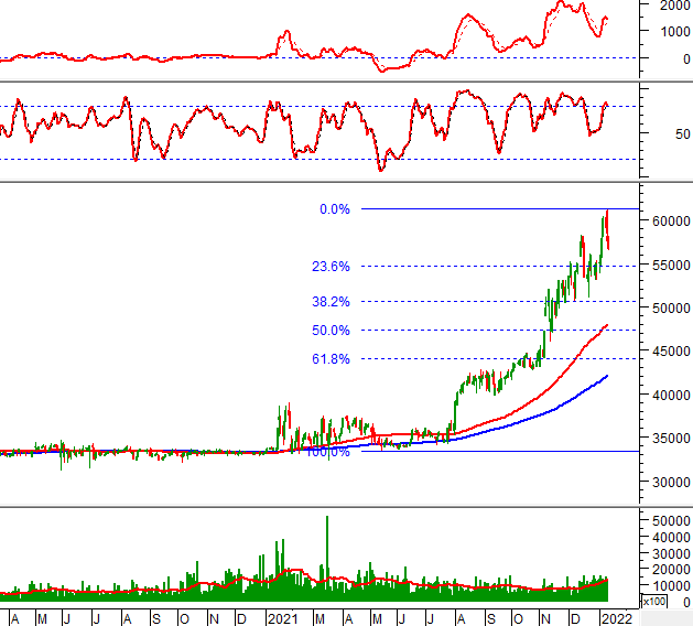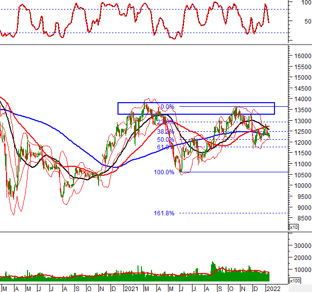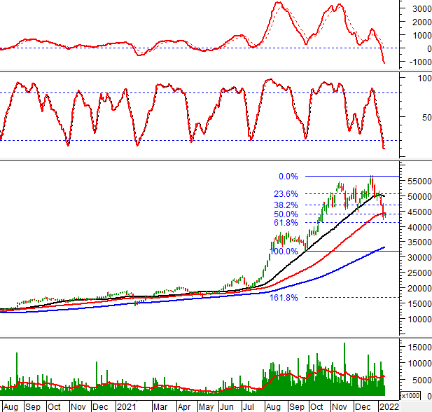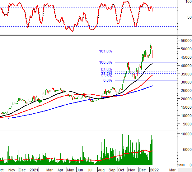 Trong phiên giao dịch ngày 12/01/2022, giá cổ phiếu HTN rơi xuống dưới ngưỡng Fibonacci Retracement 161.8% (tương đương vùng 48,000-49,000).