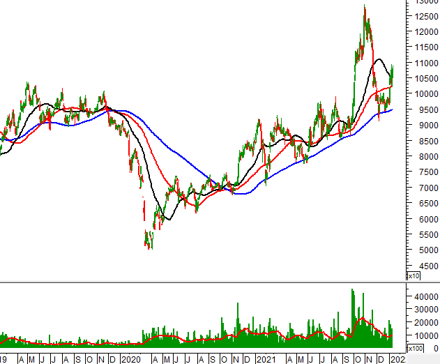 Giá xuất hiện cây nến White Marubozu trong phiên giao dịch ngày 12/01/2022 và đồng thời phá vỡ hoàn toàn đường SMA 50 ngày.