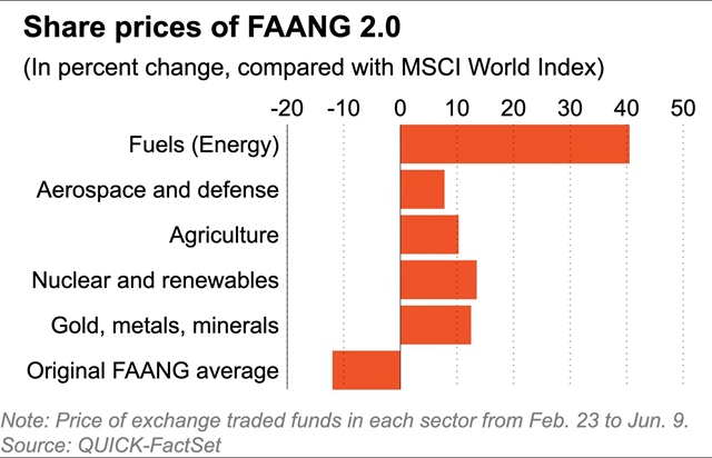 Ngay sau khi chiến tranh Ukraine bùng nổ cuối tháng 2, hai nhà chiến lược Joseph Quinlan và Lauren Sanfilippo của ngân hàng tư nhân BofA (Bank of America) bắt đầu chào hàng một nhóm cổ phiếu mới như là một sự thay thế cho nhóm cổ phiếu đang giữ vị thế thống trị thị trường: nhóm FAANG cũ gồm các hãng công nghệ khổng lồ của Mỹ như Facebook (hiện là Meta), Apple, Amazon, Netflix va Google.