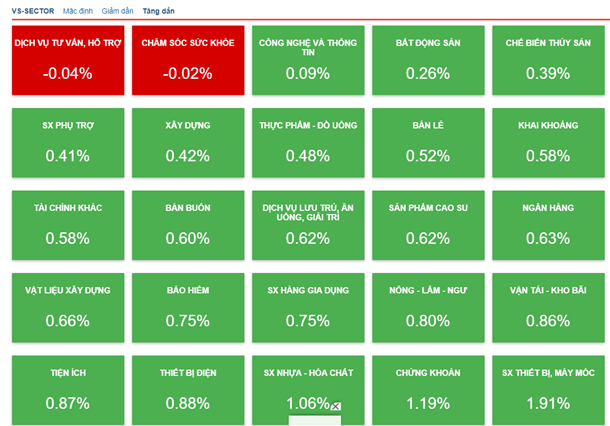 Theo VietstockFinance, đang có tới 23 nhóm ngành xanh/2 nhóm giảm giá.
