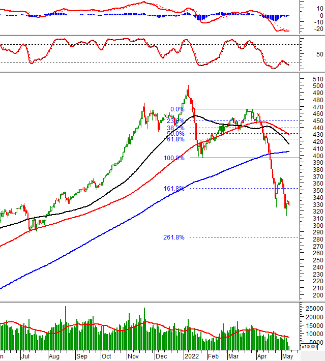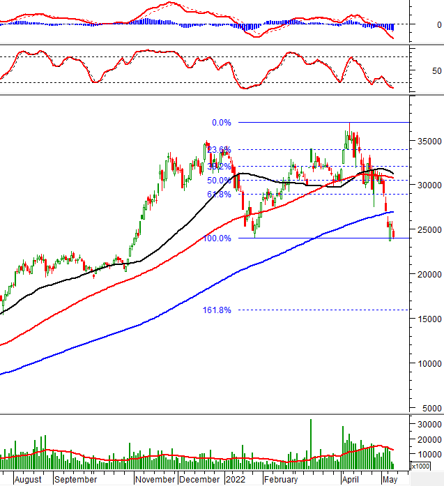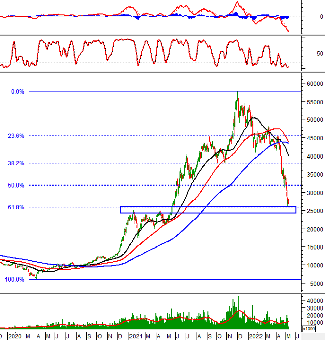 Giá cổ phiếu đã có biểu hiện tích cực sau khi test vùng 24,000-26,000 (tương đương ngưỡng Fibonacci Retracement 61.8% và đỉnh cũ đã bị vượt qua tháng 01/2021). Nếu vùng này trụ vững thì tình hình sẽ bớt bi quan hơn.