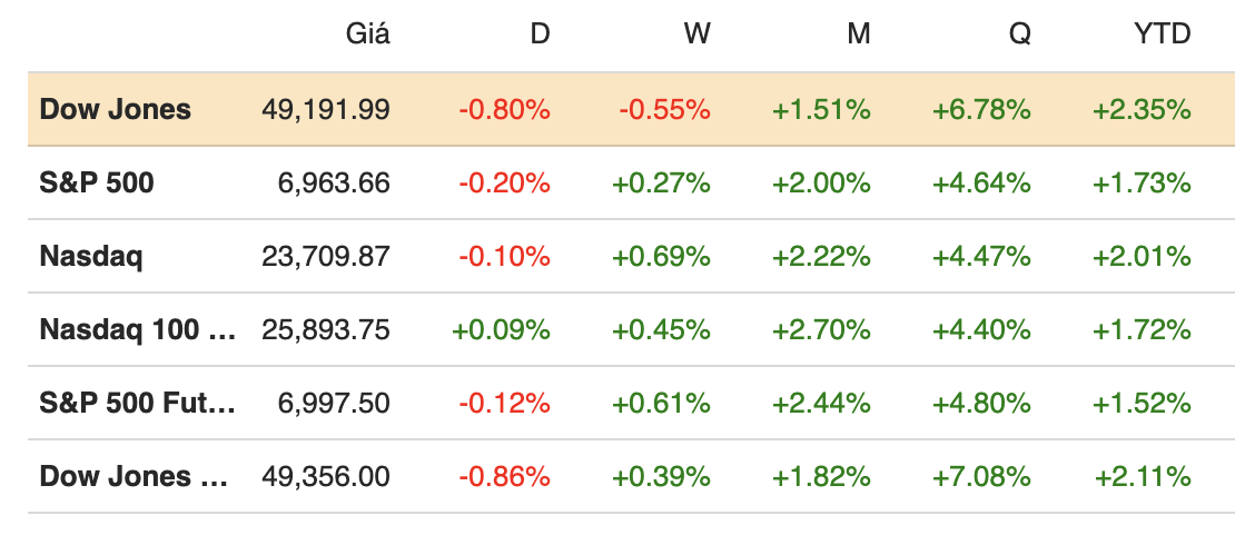 Khép phiên ngày 13/01, chỉ số S&P 500 giảm 0.19%, chốt phiên tại 6,963.74 điểm. Dow Jones mất 398.21 điểm, tương đương 0.8%, xuống 49,191.99 điểm. Nasdaq Composite giảm 0.1%, kết phiên ở 23,709.87 điểm.