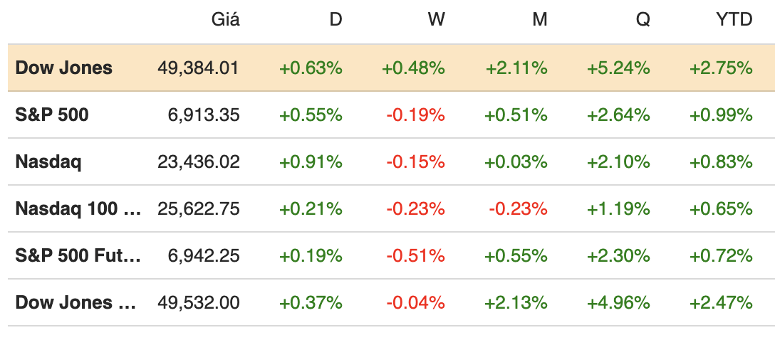 Khép phiên ngày 22/01, chỉ số Dow Jones tăng 306.78 điểm, tương đương 0.63%, và đóng cửa ở 49,384.01 điểm. Chỉ số gồm 30 cổ phiếu này đã lấy lại phần nào mức sụt giảm hồi đầu tuần sau thông báo áp thuế mới với châu Âu của Tổng thống Donald Trump. S&P 500 tăng 0.55%, chốt phiên tại 6,913.35 điểm. Trong khi đó, Nasdaq Composite tăng 0.91%, lên 23,436.02 điểm, nhờ lực đẩy từ các cổ phiếu Nvidia, Microsoft và Meta Platforms.