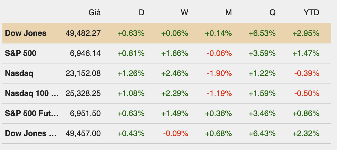 Khép phiên ngày 25/02, chỉ số S&P 500 tăng 0.81% lên 6,946.13 điểm, trong khi Nasdaq Composite tăng 1.26% lên 23,152.08 điểm. Dow Jones tăng 307.65 điểm, tương đương 0.63%, lên 49,482.15 điểm.