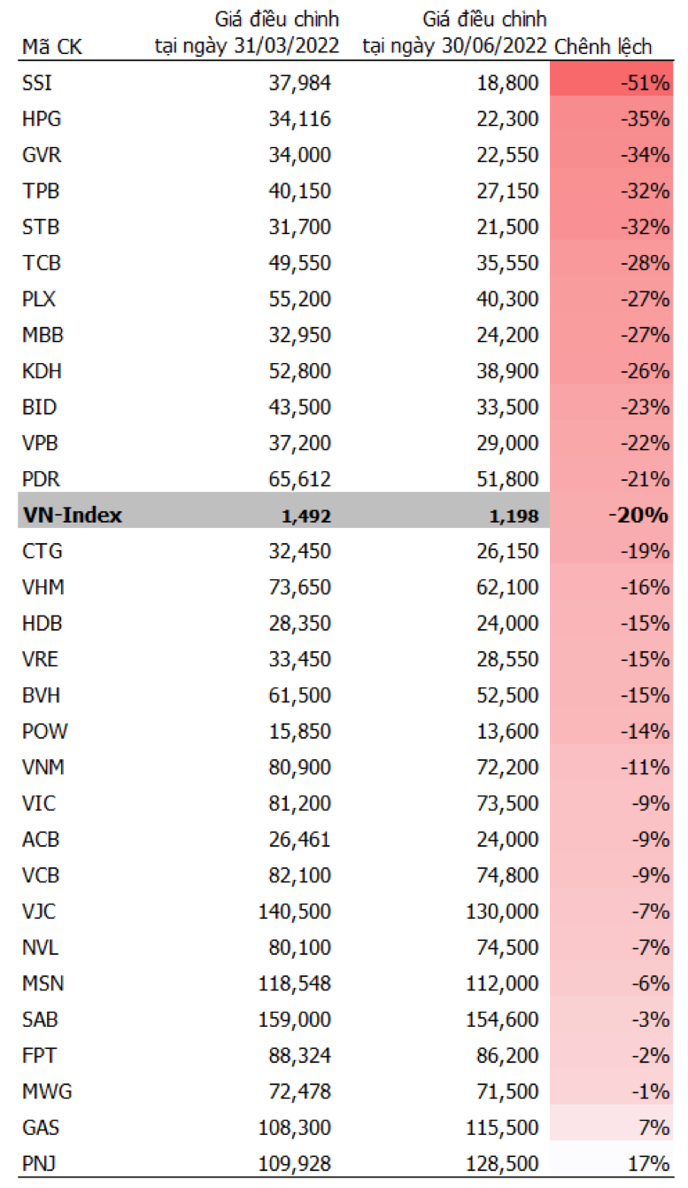 SSI, HPG, GVR và 9 cổ phiếu khác của VN30 giảm mạnh hơn VN-Index trong quý 2