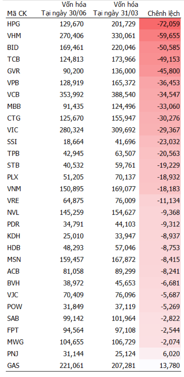 Trong kỳ, vốn hóa HPG “bốc hơi” hơn 72 ngàn tỷ đồng, giảm mạnh nhất trong nhóm VN30. Kế đó là VHM với gần 60 ngàn tỷ đồng, BID (50.5 ngàn tỷ), TCB (49 ngàn tỷ).