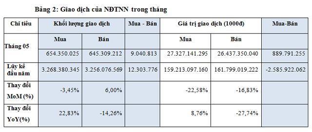 Đối với giao dịch cổ phiếu của nhà đầu tư nước ngoài, tổng giá trị giao dịch trong tháng 5 đạt gần 53.8 ngàn tỷ đồng, chiếm gần 9% tổng giá trị giao dịch cả chiều mua và bán của toàn thị trường. Nhà đầu tư nước ngoài đã thực hiện mua ròng trong tháng với giá trị trên 889.79 triệu đồng.