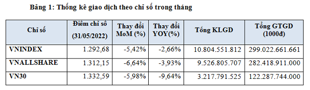 Tháng 5, VN-Index ghi nhận mức giảm 5.42% về còn 1,292.68 điểm, tương ứng giảm 13.72% so với cuối năm 2021. VN30 về mức 1,332.59 điểm, giảm gần 6% so với tháng trước, tương ứng giảm 13.23% so với cuối năm 2021.