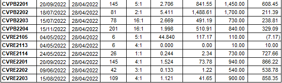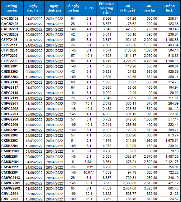 Dựa trên phương pháp định giá phù hợp với thời điểm khởi đầu là ngày 28/04/2022, mức giá hợp lý của các chứng quyền đang được giao dịch trên thị trường được thể hiện như sau: