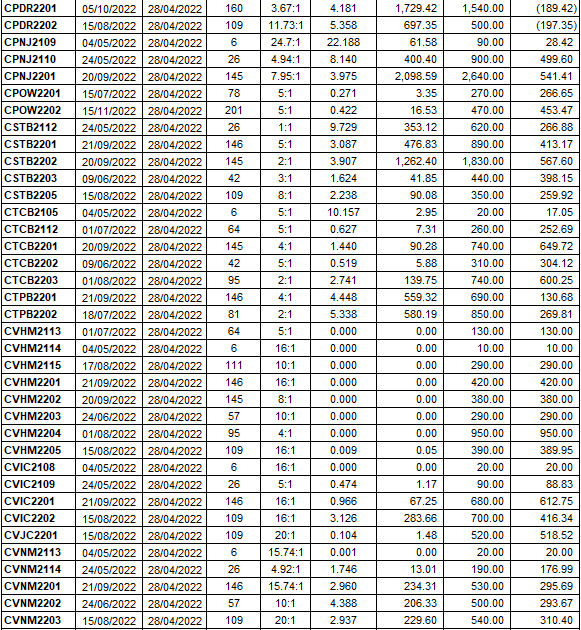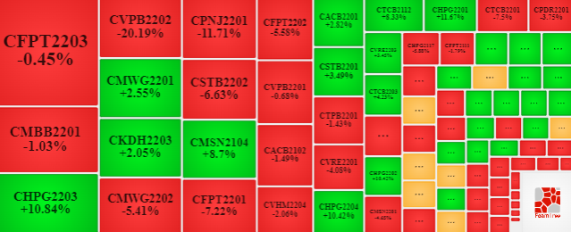 Ngược lại, số mã giảm có sự vượt trội, trong đó đa phần các mã có mức giảm dưới 10% như CTCB2201, CMWG2202, CVNM2202, CVRE2202… Những mã giảm mạnh trên 20% xuất hiện ở các mã đáo hạn cuối tháng 4 như CPNJ2109 (-55%), CVHM2114 (-50%), CMBB2109 (-38.46%), CVIC2108 (-33.33%)…