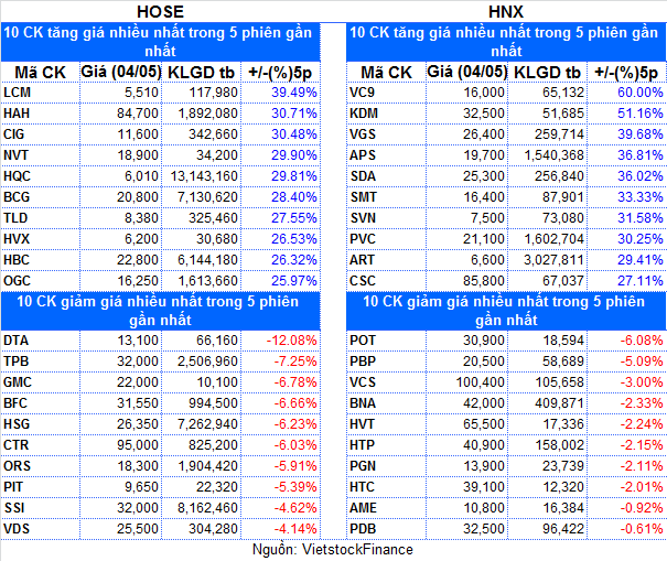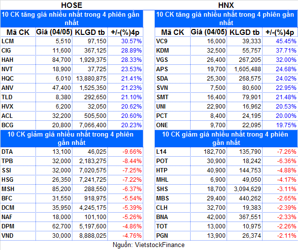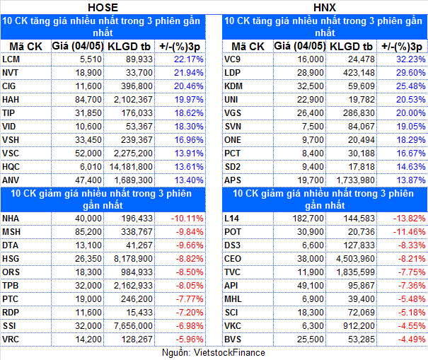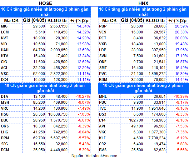 Danh sách các mã cổ phiếu tăng và giảm mạnh nhất những phiên gần đây theo số liệu thống kê của Vietstock.