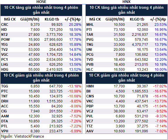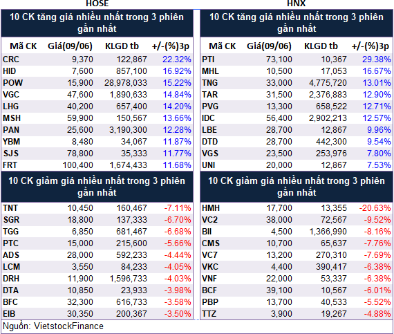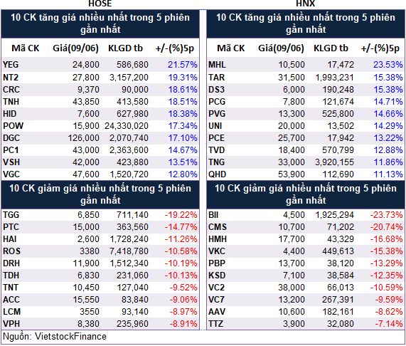 Danh sách các mã cổ phiếu tăng và giảm mạnh nhất những phiên gần đây theo số liệu thống kê của Vietstock.