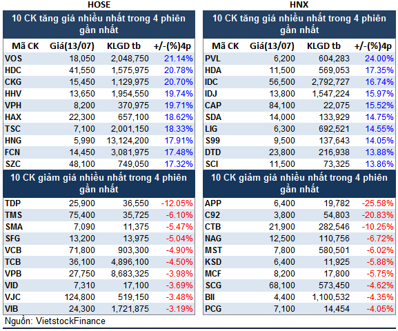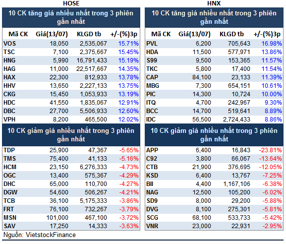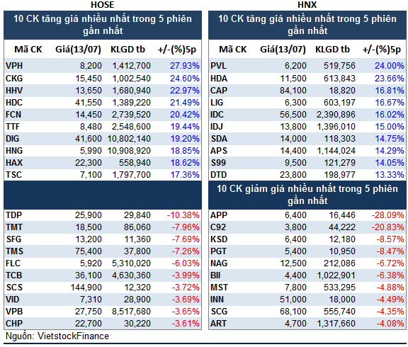 Danh sách các mã cổ phiếu tăng và giảm mạnh nhất những phiên gần đây theo số liệu thống kê của Vietstock.
