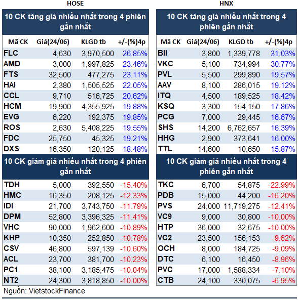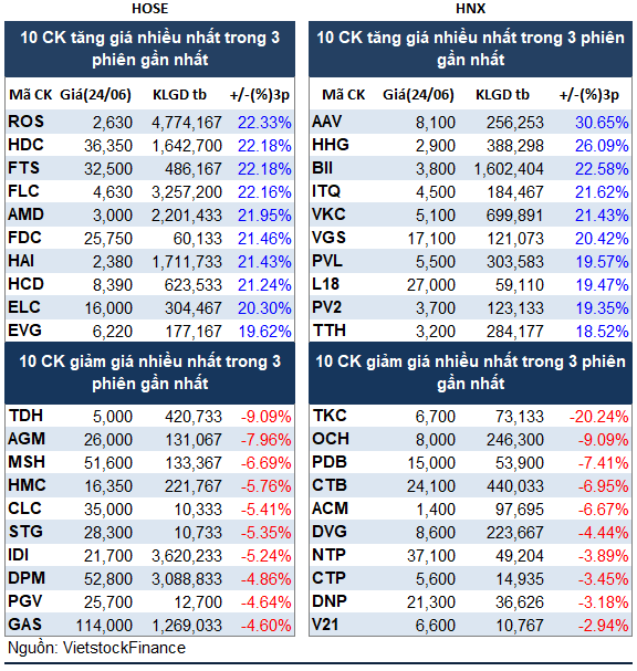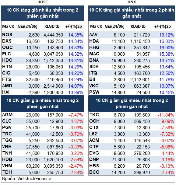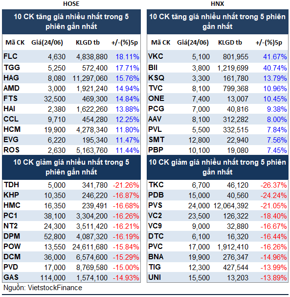 Danh sách các mã cổ phiếu tăng và giảm mạnh nhất những phiên gần đây theo số liệu thống kê của Vietstock.
