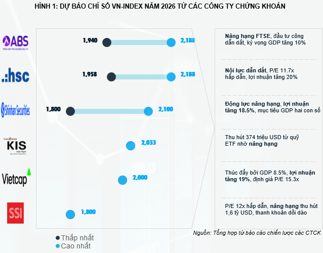 Các công ty chứng khoán nhìn nhận triển vọng của VN-Index năm 2026 dựa trên giả định tăng trưởng nền kinh tế tiếp tục duy trì ở mức cao, cùng với sự cải thiện rõ nét của lợi nhuận doanh nghiệp. Theo tổng hợp, các kịch bản dự báo vùng điểm mục tiêu của VN-Index trải rộng từ khoảng 1,800 trong kịch bản thận trọng đến trên 2,100 điểm trong những kịch bản tích cực hơn. Điểm chung trong các dự báo là chỉ số được đặt ở mặt bằng cao hơn hiện tại, phản ánh niềm tin rằng thị trường đã tích lũy đủ nền tảng để bước sang một giai đoạn tăng trưởng mới. Việc hình thành mặt bằng kỳ vọng cao hơn cũng hàm ý rằng, những nhịp biến động ngắn hạn có thể xuất hiện nhưng xu hướng chủ đạo vẫn được đánh giá theo hướng tích cực.