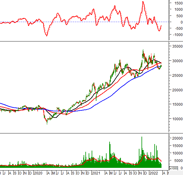 Giá chững lại đà giảm mạnh sau khi test lại đáy cũ tháng 12/2021 (tương đương vùng 26,500-27,000). Đây sẽ tiếp tục là hỗ trợ mạnh trong thời gian tới.