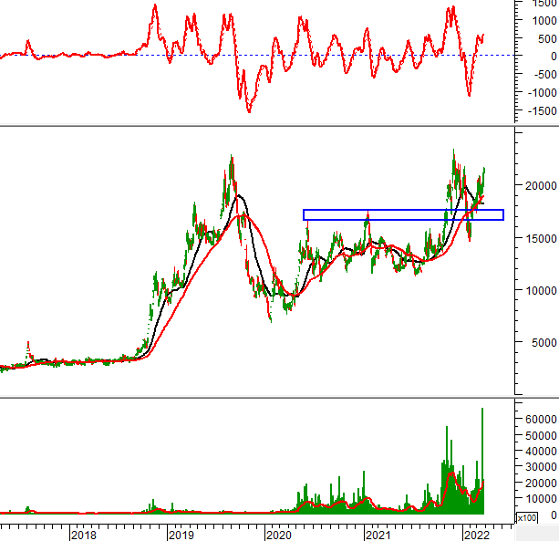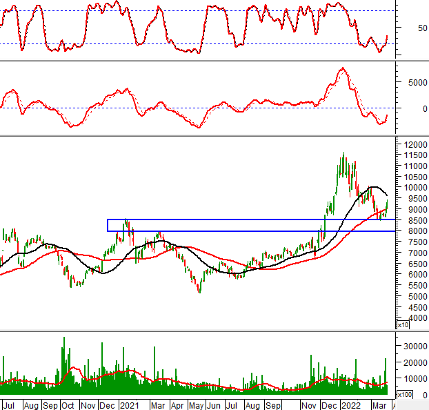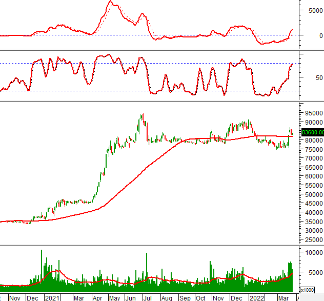 Vùng 80,000-85,000 (tương đương đỉnh cũ đã bị vượt qua của tháng 01/2021 và tháng 07/2020) đã trụ vững và chỉ báo Stochastic Oscillator, MACD đều cho mua mạnh nên khả năng tăng trưởng được cải thiện.