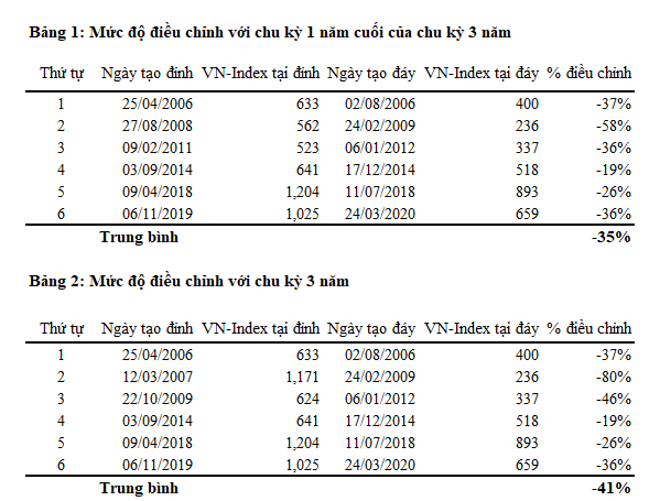 Bảng 1 và 2 thống kê mức độ điều chỉnh của các chu kỳ 1 năm và 3 năm trước đó. Với chu kỳ 3 năm, mức điều chỉnh trung bình của 6 chu kỳ trước là 41%. Nếu tính từ vùng đỉnh chu kỳ 3 năm thứ 7 (vùng 1,530 điểm) thì chỉ số VN-Index có thể điều chỉnh về 909 điểm để hình thành đáy chu kỳ 3 năm trước khi phục hồi trở lại.