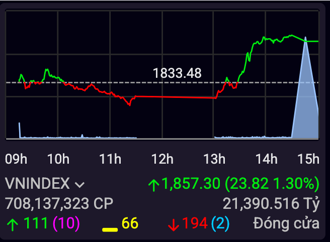 Cùng với đó, VHM (+3,09%), VRE (+2,22%) và một số mã ngân hàng như TCB (+0,92%), MBB (+0,38%) cũng góp phần củng cố đà tăng. Nhờ lực kéo này, VN-Index bứt phá mạnh mẽ trong phiên ATC, đóng cửa tại 1.857,30 điểm, tăng 23,82 điểm (+1,30%), trở thành một trong những thị trường tăng mạnh nhất khu vực châu Á trong ngày.