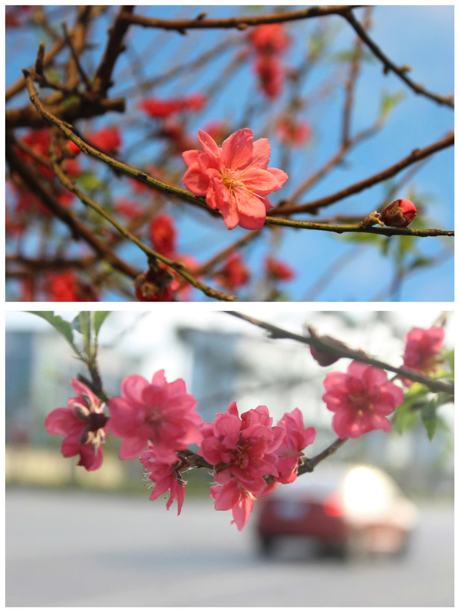 Dưới tiết trời nắng hanh, những gốc đào cổ ở Hà Tĩnh khoe trọn sắc đỏ đặc trưng, tạo điểm nhấn cho phố phường ngày cận Tết.