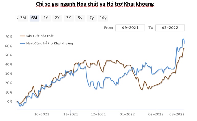 Kể từ khi Nga bắt đầu tấn công Ukraine, chỉ số giá của nhóm ngành hỗ trợ khai khoáng và sản xuất hóa chất như nhảy dựng lên.