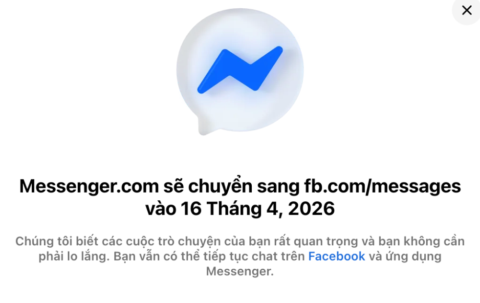 "Messenger.com sẽ chuyển sang facebook.com/messages vào 16-4-2026. Sau khi messenger.com ngừng hoạt động, hệ thống sẽ tự động chuyển bạn sang dùng facebook.com/messages để nhắn tin trên máy tính.