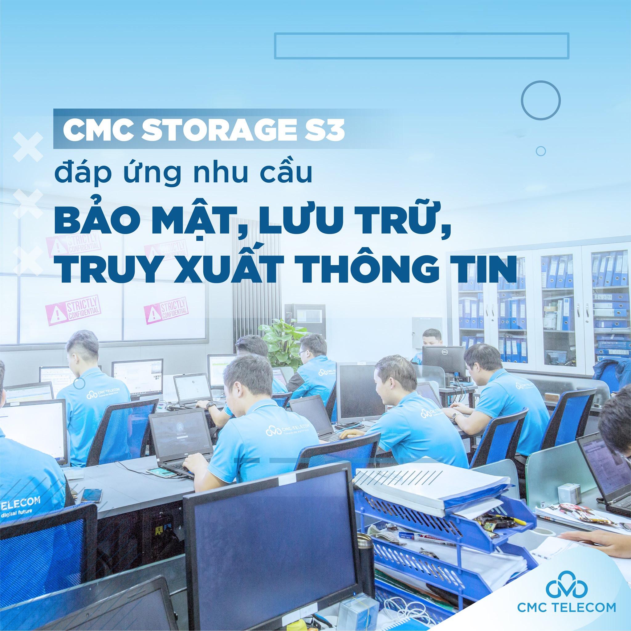 Nắm bắt nhu cầu của các doanh nghiệp, S3 Storage của CMC Telecom là giải pháp lưu trữ dữ liệu cam kết an toàn và bảo mật theo quy định của pháp luật Việt Nam. Với dịch vụ này khách hàng có thể lưu trữ theo đối tượng được xây dựng và truy xuất với khối lượng lớn và ở bất kỳ đâu như: ứng dụng của công ty, các trang web và ứng dụng di động từ bộ cảm biến IOT hoặc các thiết bị khác.