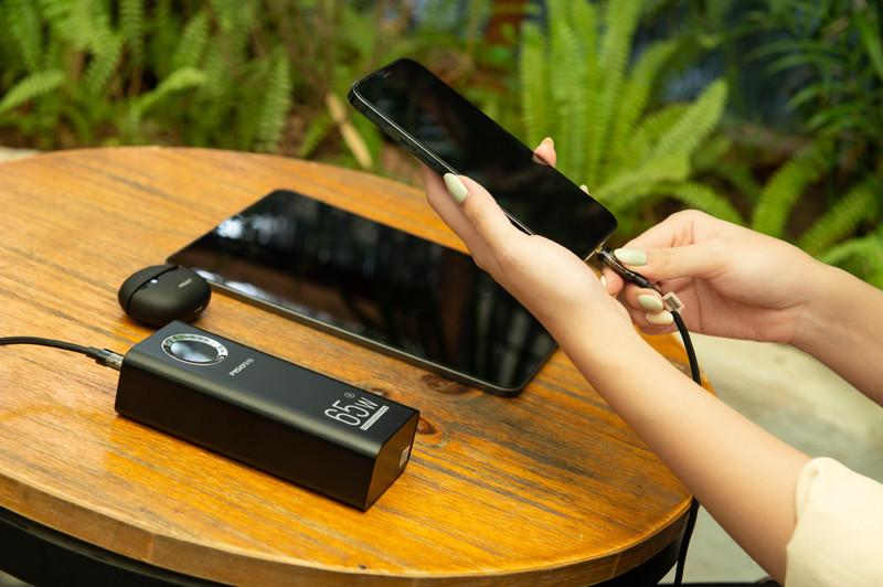 Điểm đặc biệt trên sản phẩm này là công suất sạc lên tới 65W, với giao thức sạc PD (Power Delivery). Đây là một sản phẩm ”cứu trợ” tuyệt vời khi bạn không mang theo bộ sạc của laptop hoặc bất kỳ một thiết bị nào. Sạc dự phòng có 1 cổng đầu vào micro USB 5V-3A hoặc 9V-2A, 1 cổng đầu ra/vào Type-C PD công suất tối đa 20V-3.25A, 01 cổng đầu ra Type-C công suất tối đa 9V-2A, 1 cổng ra vào USB-A công suất tối đa 9V-2A. Như vậy, bạn có thể sạc cùng lúc tới 3 thiết bị khác nhau với tốc độ khá ấn tượng.
