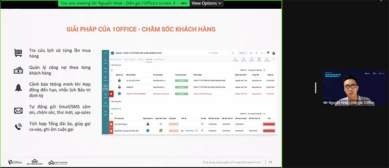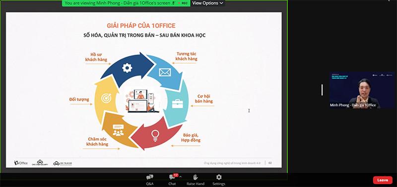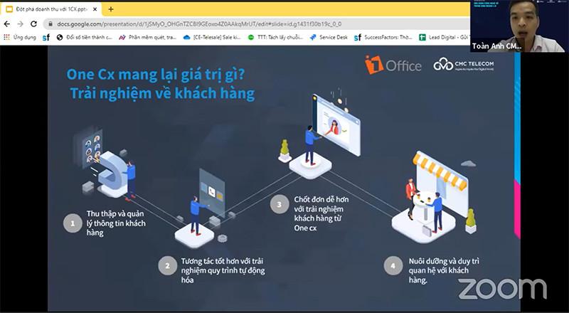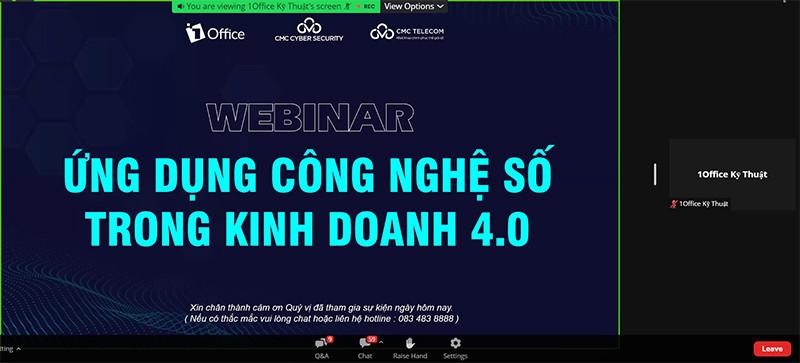 Ngày 14/10/2022 CMC Telecom phối hợp cùng CMC Cyber Security và 1Office tổ chức hội thảo trực tuyến cho doanh nghiệp về “Ứng dụng công nghệ số trong kinh doanh 4.0” trên nền tảng Zoom. Trong khuôn khổ webinar, doanh nghiệp có cơ hội tiếp cận với các giải pháp công nghệ hỗ trợ số hoá và quản trị tổng thể, nâng cao hiệu suất hoạt động vận hành, tăng cường hiệu quả kinh doanh của doanh nghiệp.